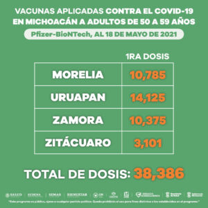 En Apatzingán (mil 435) y Lázaro Cárdenas (2 mil 860) se han aplicado 4 mil 295 dosis de CanSino, mientras que Morelia (10 mil 785), Uruapan (14 mil 125), Zamora (10 mil 375) y Zitácuaro (3 mil 101) suman 38 mil 386 dosis de Pfizer.