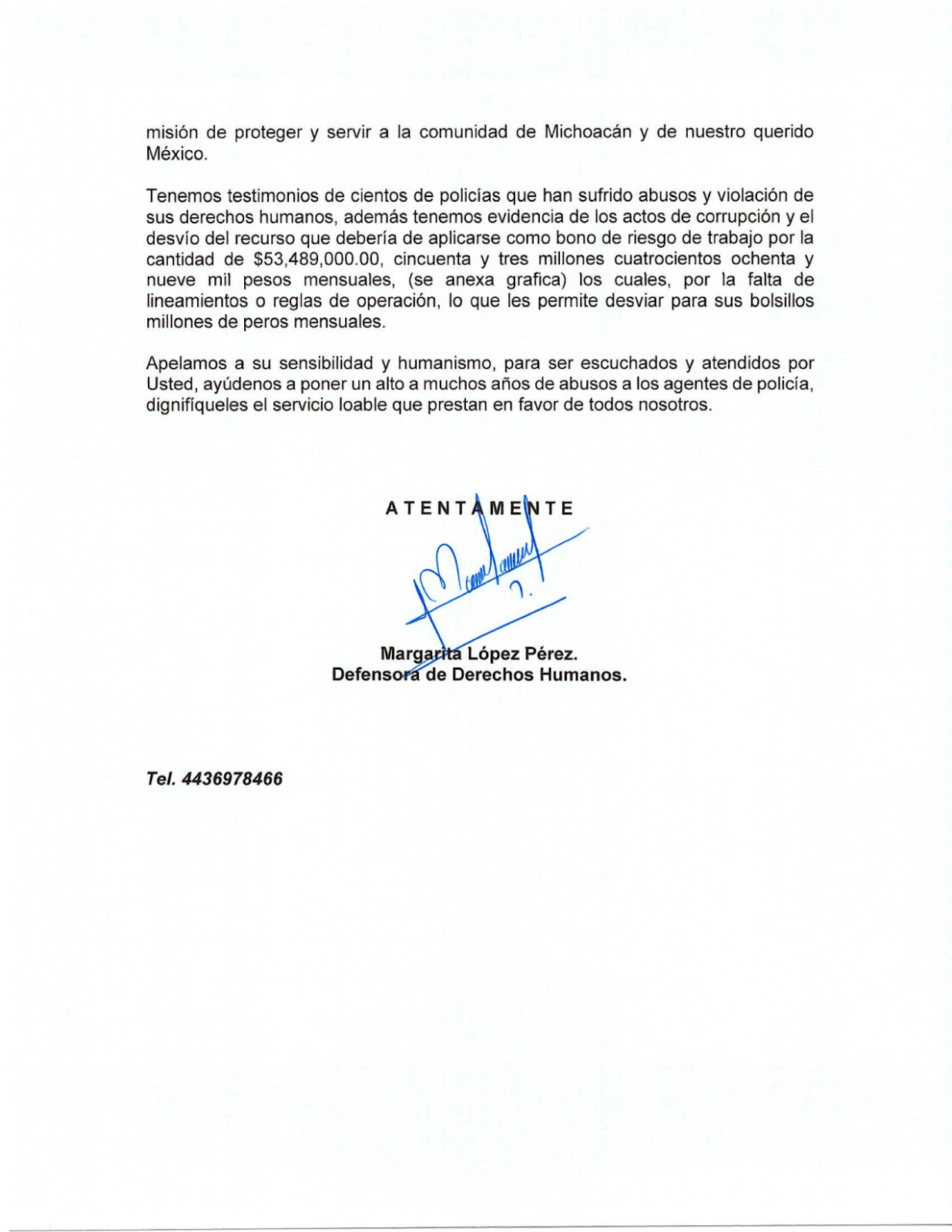 Ante esta triste realidad que califica como insostenible, apeló a la sensibilidad y humanismo que caracteriza de la Dra Sheinbaum para ser escuchados y atendidos por ella, a fin de tener la ayuda que se requiere para poner un alto a muchos años de abusos a los policías y se dignifique el servicio loable que prestan a favor de todos los michoacanos.