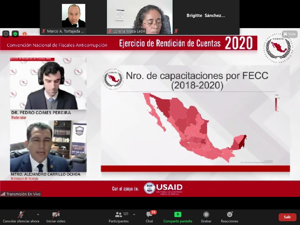 En el marco de dicha actividad celebrada a nivel nacional de manera virtual, con apoyo de USAID (Agencia de los Estados Unidos para el Desarrollo Internacional) y derivada de los acuerdos establecidos por la Comisión Nacional de Fiscales Anticorrupción (CONAFA), Carrillo Ochoa, subrayó la importancia de tener cubierto este rubro, ya que ello permitiría llevar a cabo actividades de capacitaciones de manera constante y especializada.