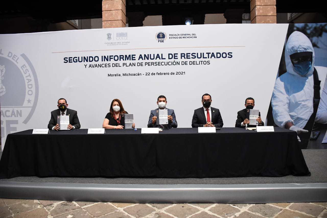 El presidente de la Mesa Directiva del Congreso del Estado de Michoacán, Octavio Ocampo Córdova; la diputada Cristina Portillo Ayala, presidenta de la Junta de Coordinación Política (JUCOPO); los diputados José Antonio Salas Valencia y Humberto González Villagómez, presidentes de las Comisiones de Justicia y de Seguridad Pública y Protección Civil, respectivamente, recibieron el “Segundo Informe Anual de Resultados y Avances del Plan de Persecución de Delitos” de la Fiscalía General del Estado de Michoacán (FGE), de manos de su titular, Adrián López Solis.