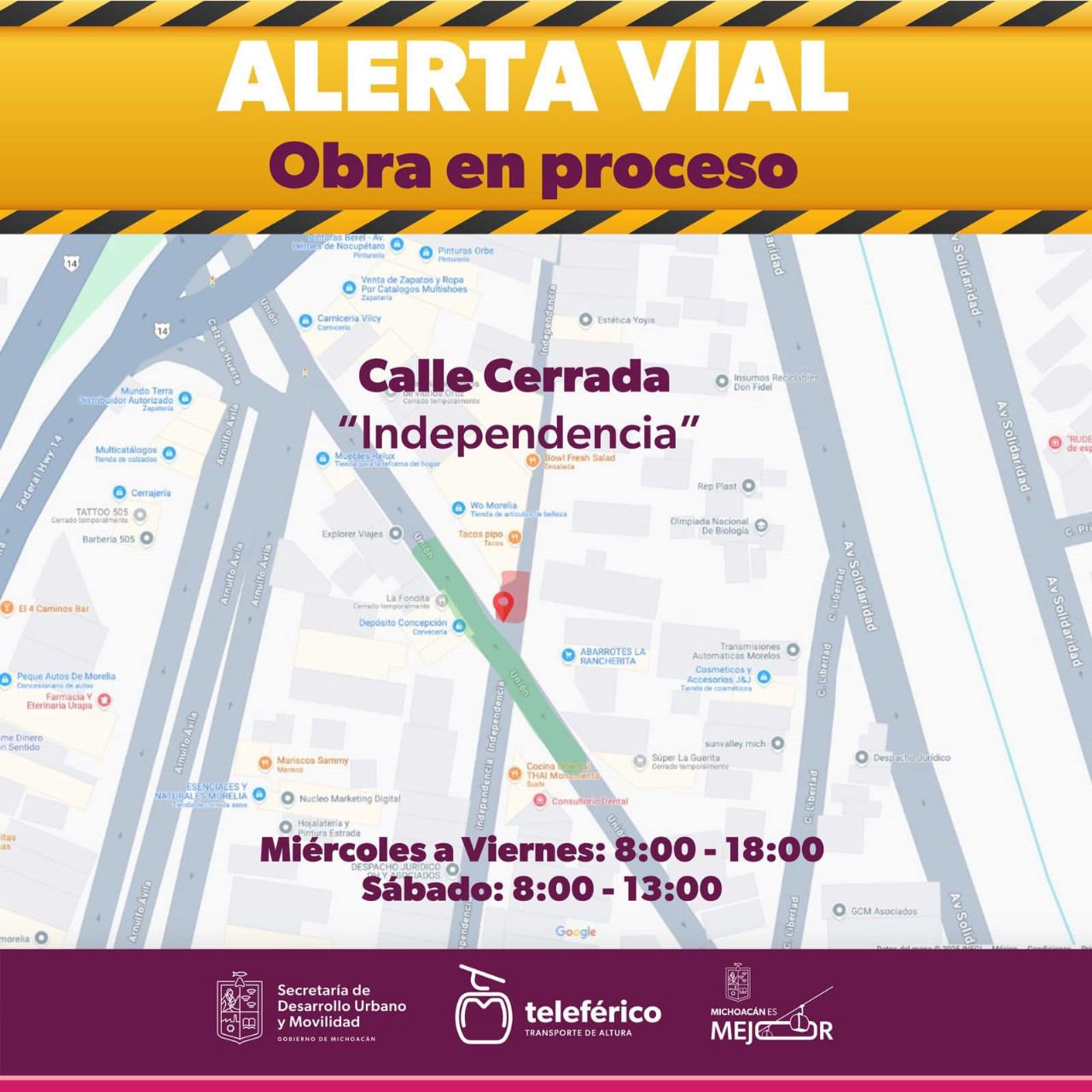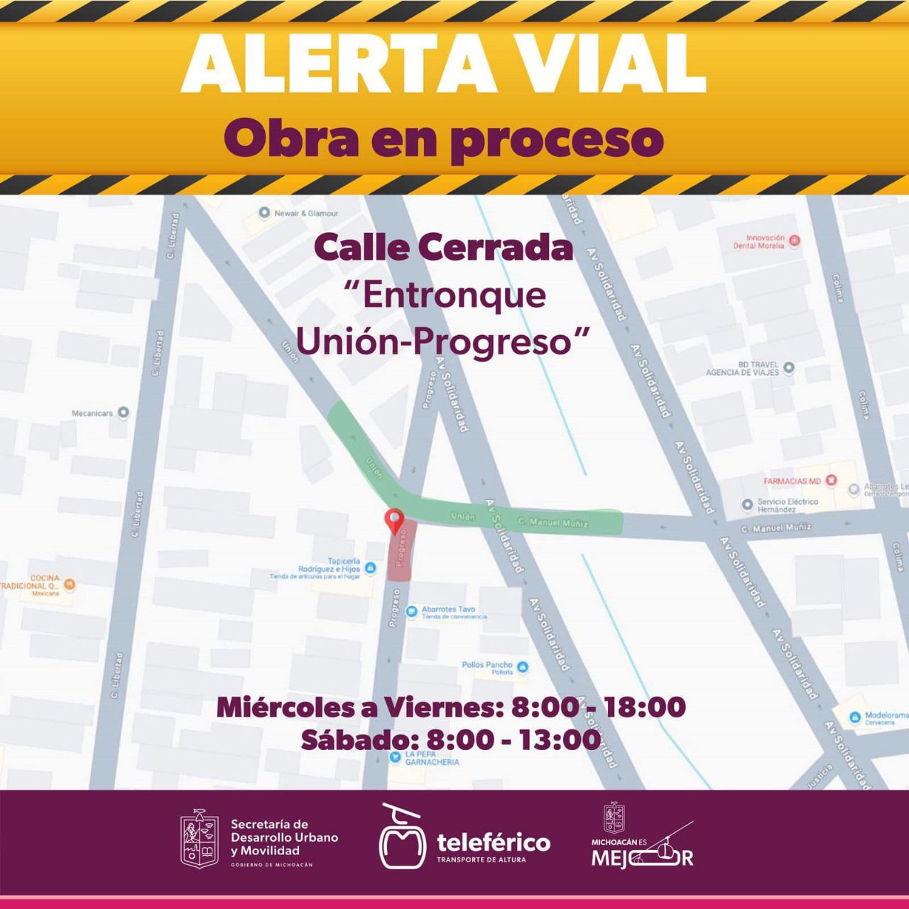 La Secretaría de Desarrollo Urbano y Movilidad (Sedum) informa que, debido a los trabajos en proceso para la construcción del teleférico de Morelia, se llevarán a cabo cierres parciales en cuatro vialidades de la ciudad.