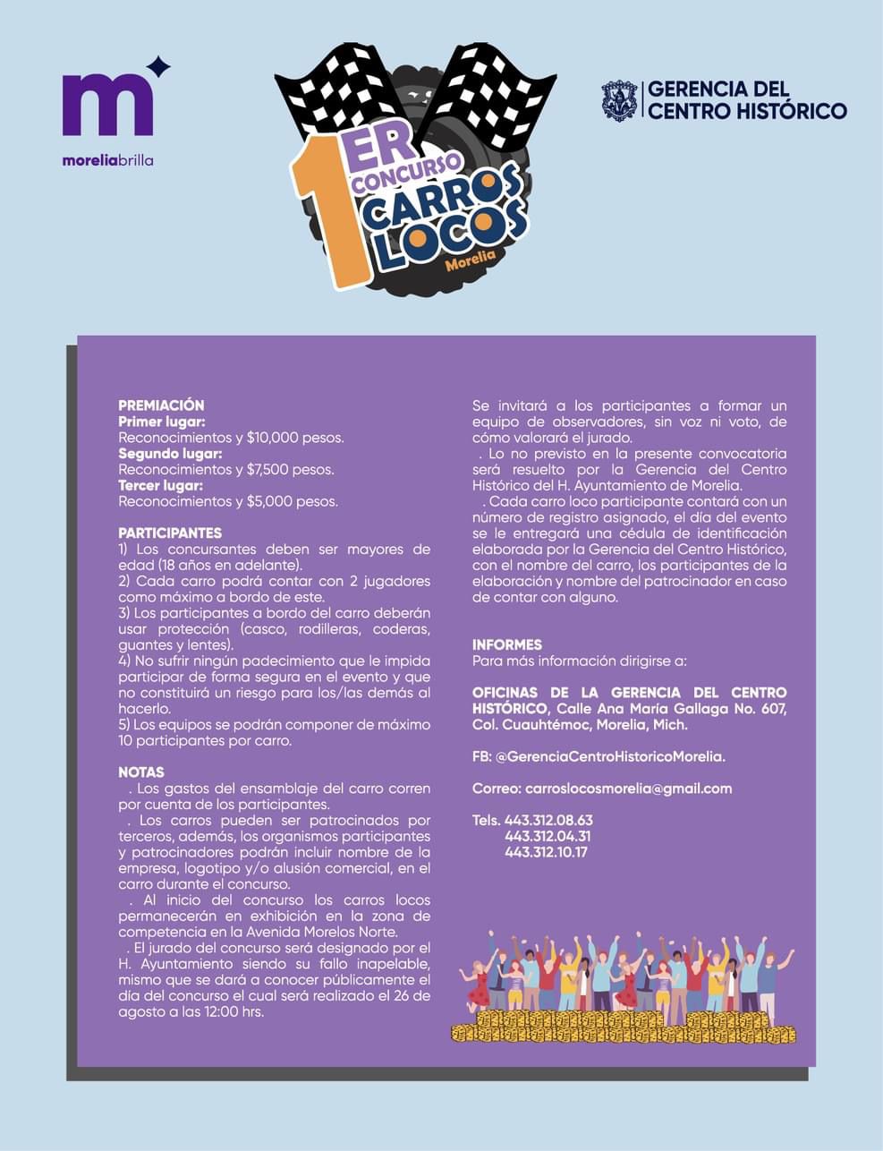 Con el objetivo de impulsar la creatividad, ingenio y promover el Patrimonio Cultural material e inmaterial de la ciudad, el Ayuntamiento a través de la Gerencia del Centro Histórico abrió la convocatoria “1er Concurso Carros Locos en Morelia 2023”, la cual invita a disfrutar de una carrera de vehículos fabricados artesanalmente, con técnicas tradicionales y que funcionen con solo la fuerza de la gravedad.
