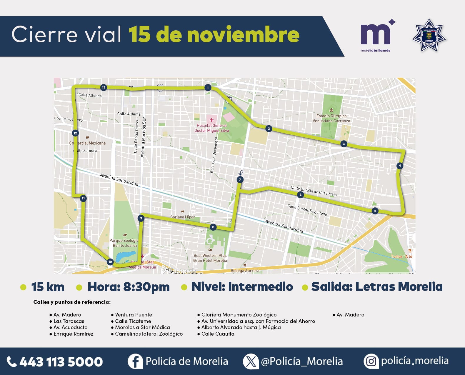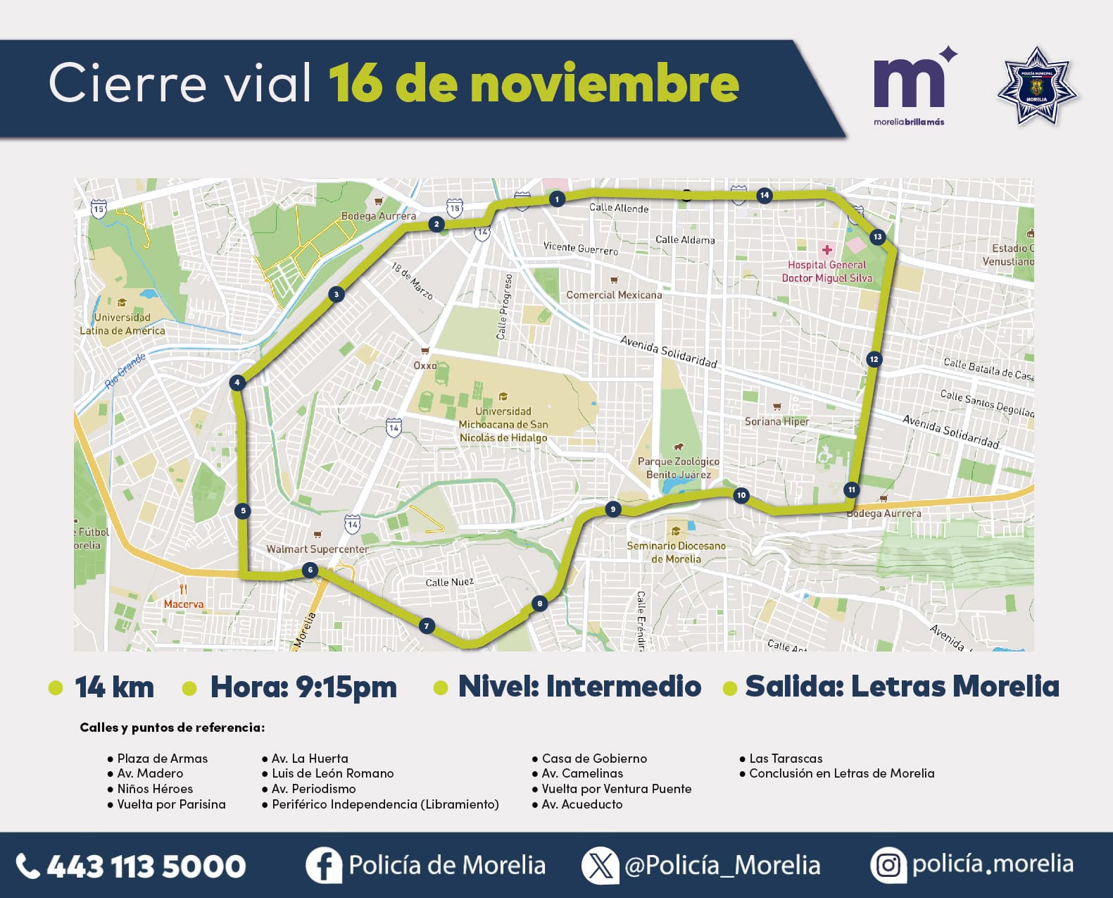 Por lo anterior, el Gobierno Municipal, a través de la Policía Morelia, anuncia cortes viales sobre las siguientes rutas, mismos que serán momentáneos ya que la circulación se liberará una vez que avance el grupo de patinadores: