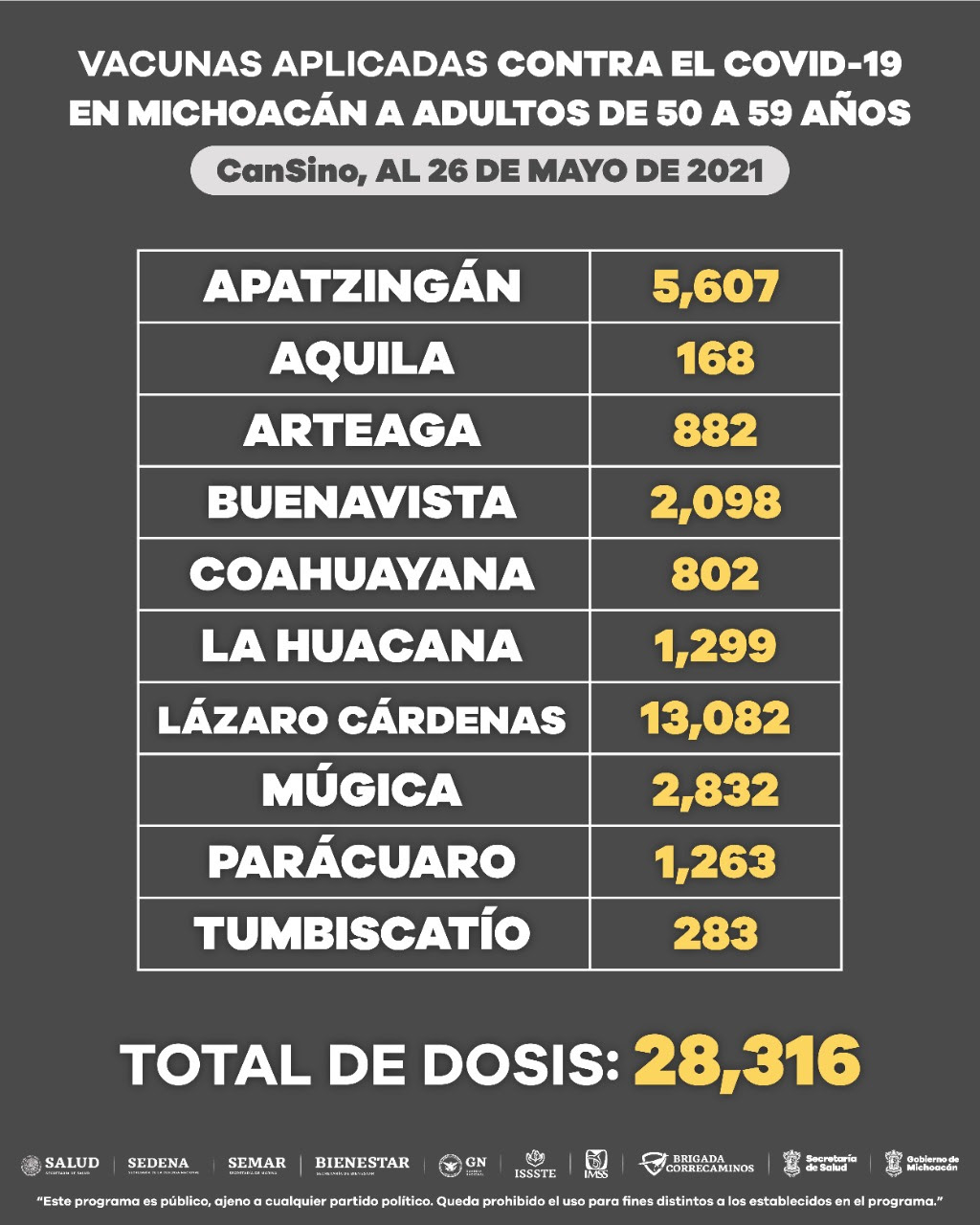 De las dosis aplicadas, 28 mil 316 fueron de CanSino, a igual número de personas, con lo que se completa su esquema de vacunación, ya que esta solo requiere de una sola dosis para la inmunización.