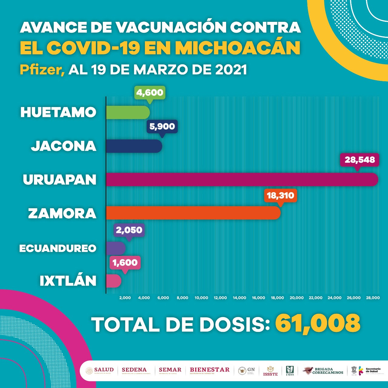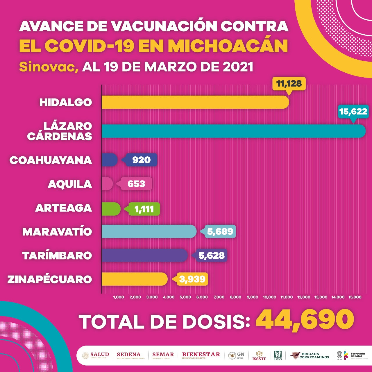 Este viernes 19 de marzo se comenzará a vacuna en el municipio de Nuevo Urecho y el sábado 20 de marzo arrancará este proceso en Morelia y Zitácuaro, a efecto de seguir protegiendo a este sector de la población.
