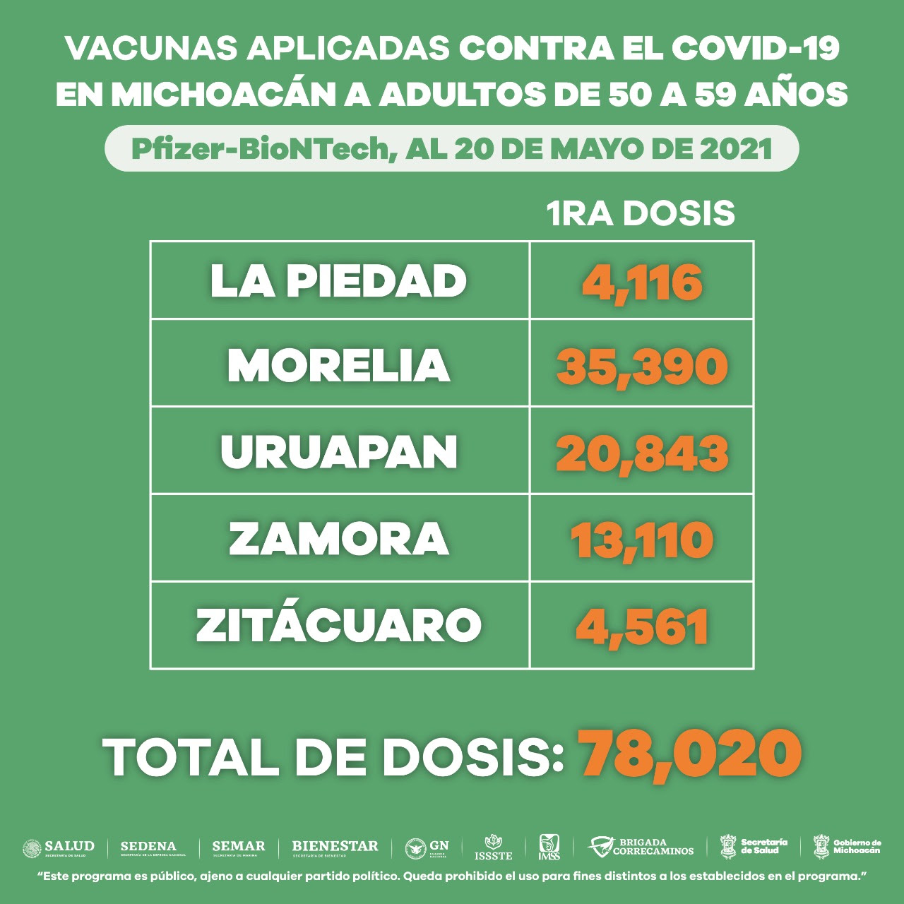 Las 78 mil 20 vacunas restantes son de la farmacéutica Pfizer, biológico aplicado a población de La Piedad, Morelia, Uruapan, Zamora y Zitácuaro.