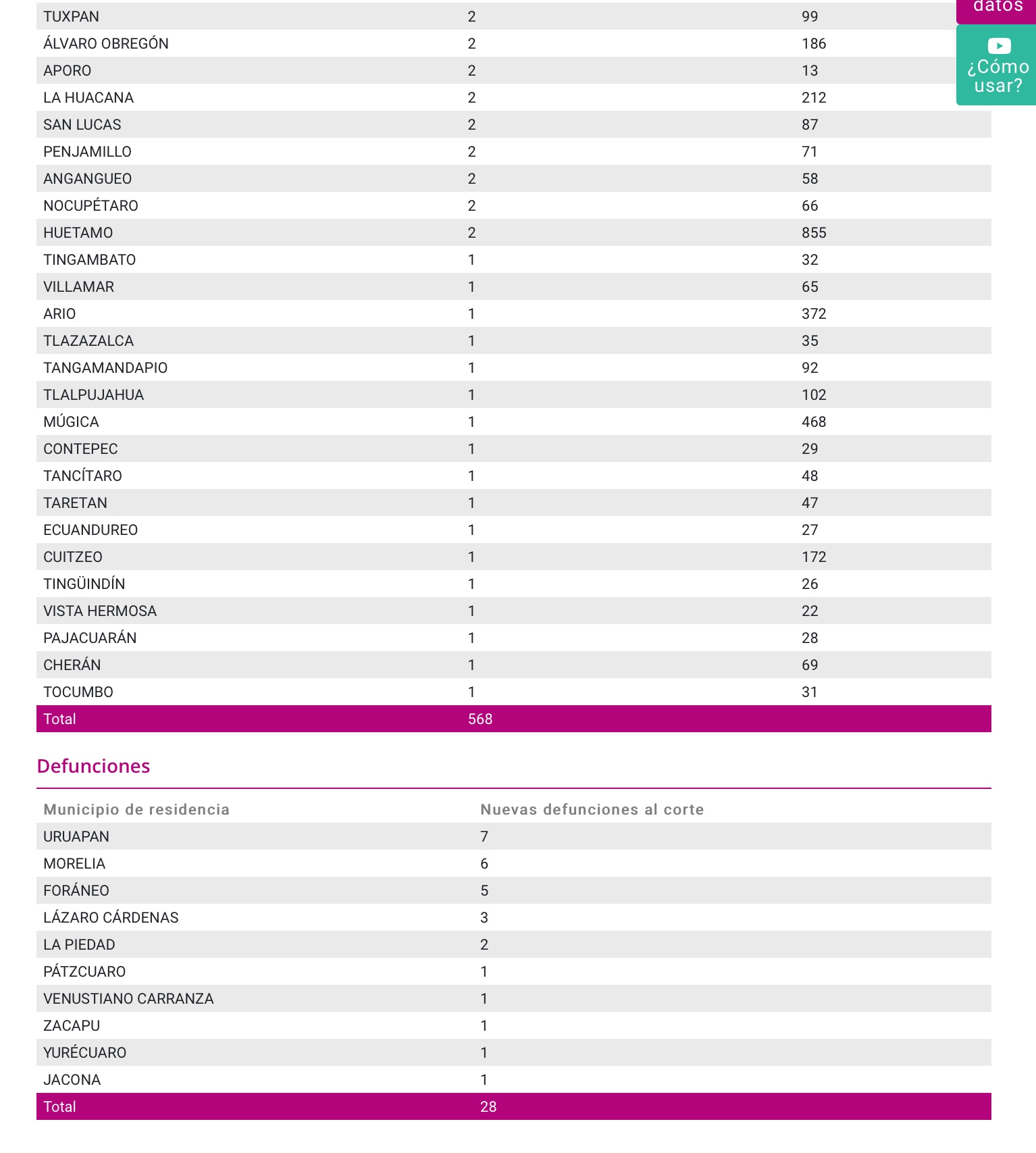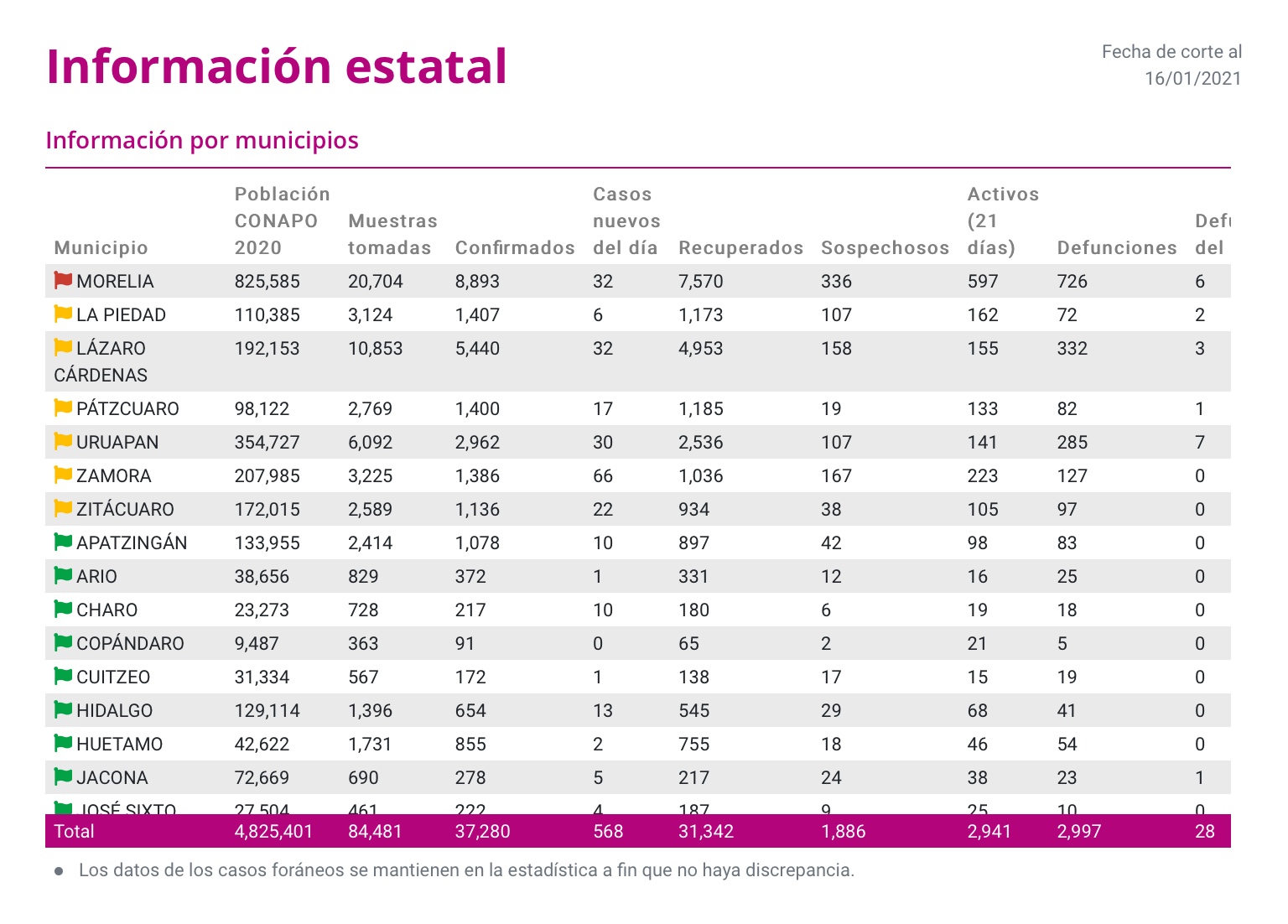 De las 28 defunciones, se registraron 7 en Uruapan, 6 en Morelia, 5 foráneos, 3 en Lázaro Cárdenas, 2 en La Piedad y cinco en el mismo número de municipios.