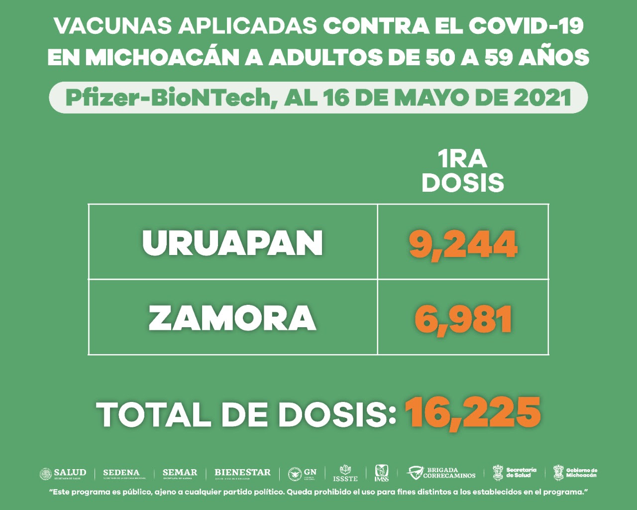 Asimismo, las personas de 50 a 59 años de edad deben estar al tanto de los lugares y fechas donde se estará aplicando el biológico, para que acudan al módulo que les corresponda; en Uruapan y Zamora 16 mil 225 personas ya recibieron la primera dosis de Pfizer.
