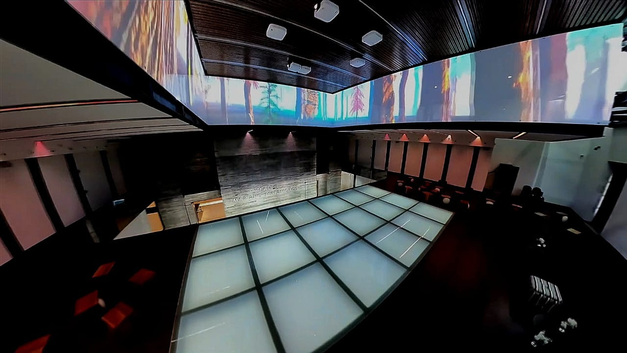 El mezzanine del Teatro Mariano Matamoros posee un formato único, donde el público puede apreciar sobre los paneles superiores arte pictórico y muralista animado por computadora en formato de video mapping.