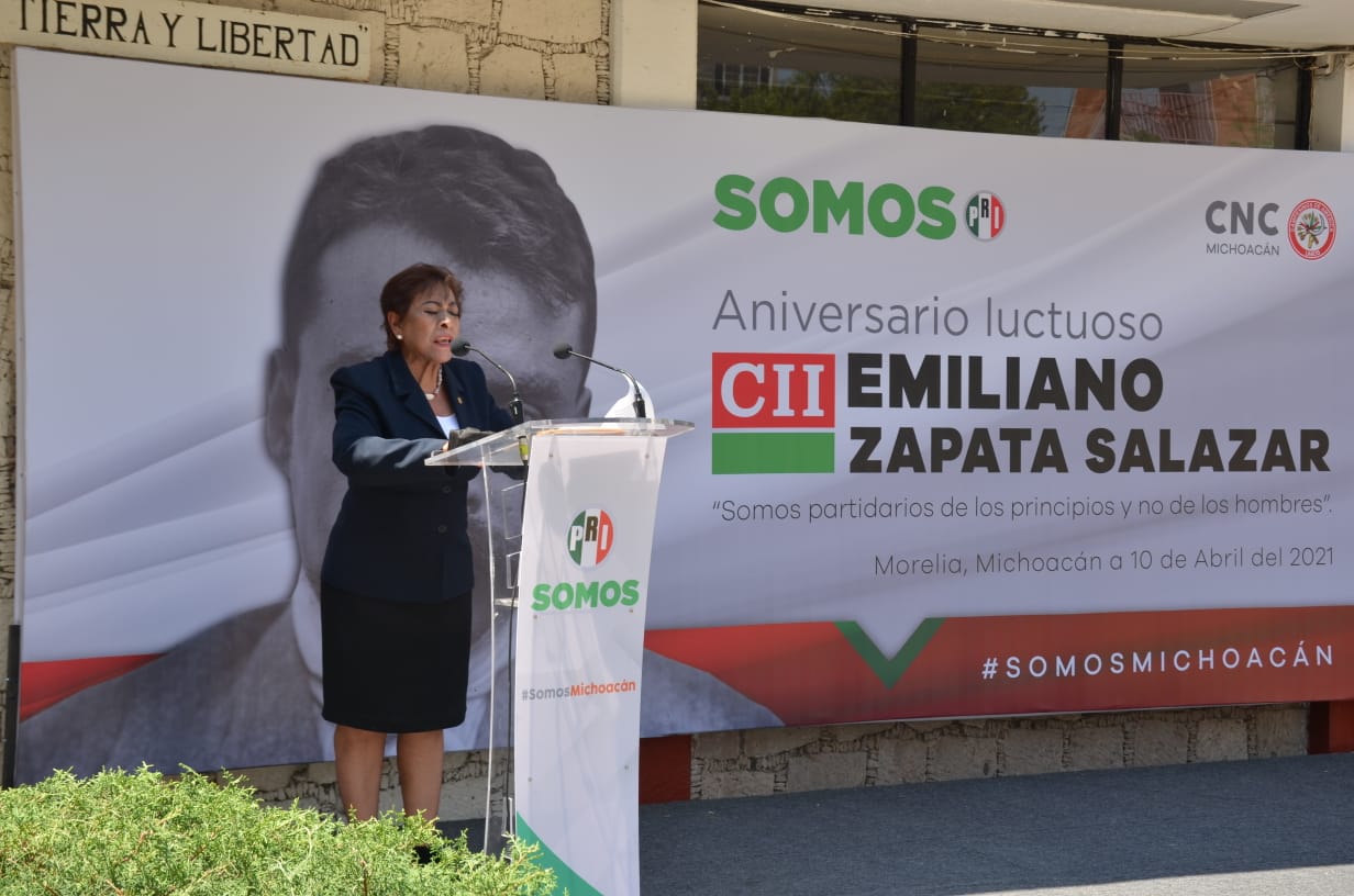Morelia, Michoacán, a 10 de abril de 2021. La encargada de la Liga de Comunidades Agrarias y Sindicatos de Campesinos de Michoacán y Enlace nacional regional de la Confederación Nacional Campesina (CNC), Emma Mondragón Navarrete, evocó a Emiliano Zapata Salazar y pidió recordarlo para reencontrar el origen y hacer de la Confederación Nacional Campesina (CNC) un verdadero bastión de productividad y de lucha permanente.