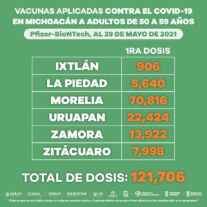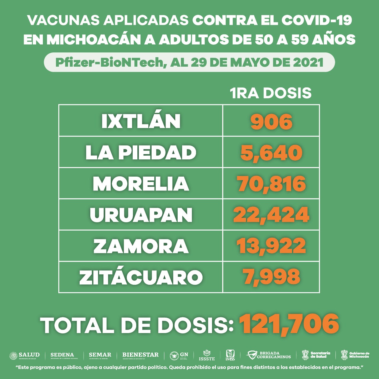 A la fecha han sido aplicadas 241 mil 611 vacunas anti COVID-19, a michoacanas y michoacanos de 50 a 59 años de edad, de 57 municipios